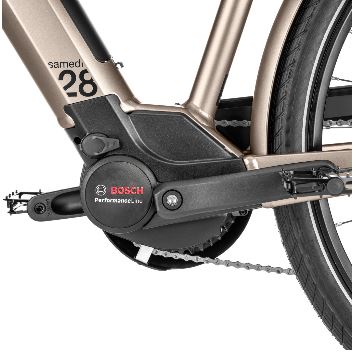 Samedi 28.2 pohání motor Bosch Performance Line s výkonem 250 W a točivým momentem 65 Nm, který poskytuje plynulou a tichou asistenci při šlapání. Baterie Bosch PowerTube s kapacitou 500 Wh umožňuje dojezd až 137 km, v závislosti na podmínkách jízdy a hmotnosti jezdce. Pro pohodlnou jízdu je kolo vybaveno odpruženou vidlicí SR Suntour NEX-E25 s 63 mm zdvihu a odpruženou sedlovkou s 40 mm zdvihu. Řazení zajišťuje 9rychlostní přehazovačka Shimano Altus RD-R2000-SGS s kazetou 11-36 zubů. Brzdění obstarávají hydraulické kotoučové brzdy Shimano MT200 s kotouči 180 mm vpředu a 160 mm vzadu. Kolo je osazeno 28″ ráfky Moustache z hliníkové slitiny 6061E s asymetrickým profilem a vnitřní šířkou 23 mm, obutými do plášťů Schwalbe Big Apple 700x50C pro stabilitu a komfort na různých površích.