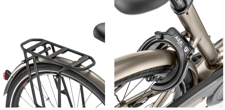 Pro zvýšení praktičnosti je model vybaven nosičem kompatibilním se systémy QL3 a MIK HD, což usnadňuje připevnění brašen a košů. Osvětlení zajišťuje přední světlo AXA Blueline s intenzitou 30 luxů a zadní světlo Spanninga Presto2Guard, obě napájená z hlavní baterie.