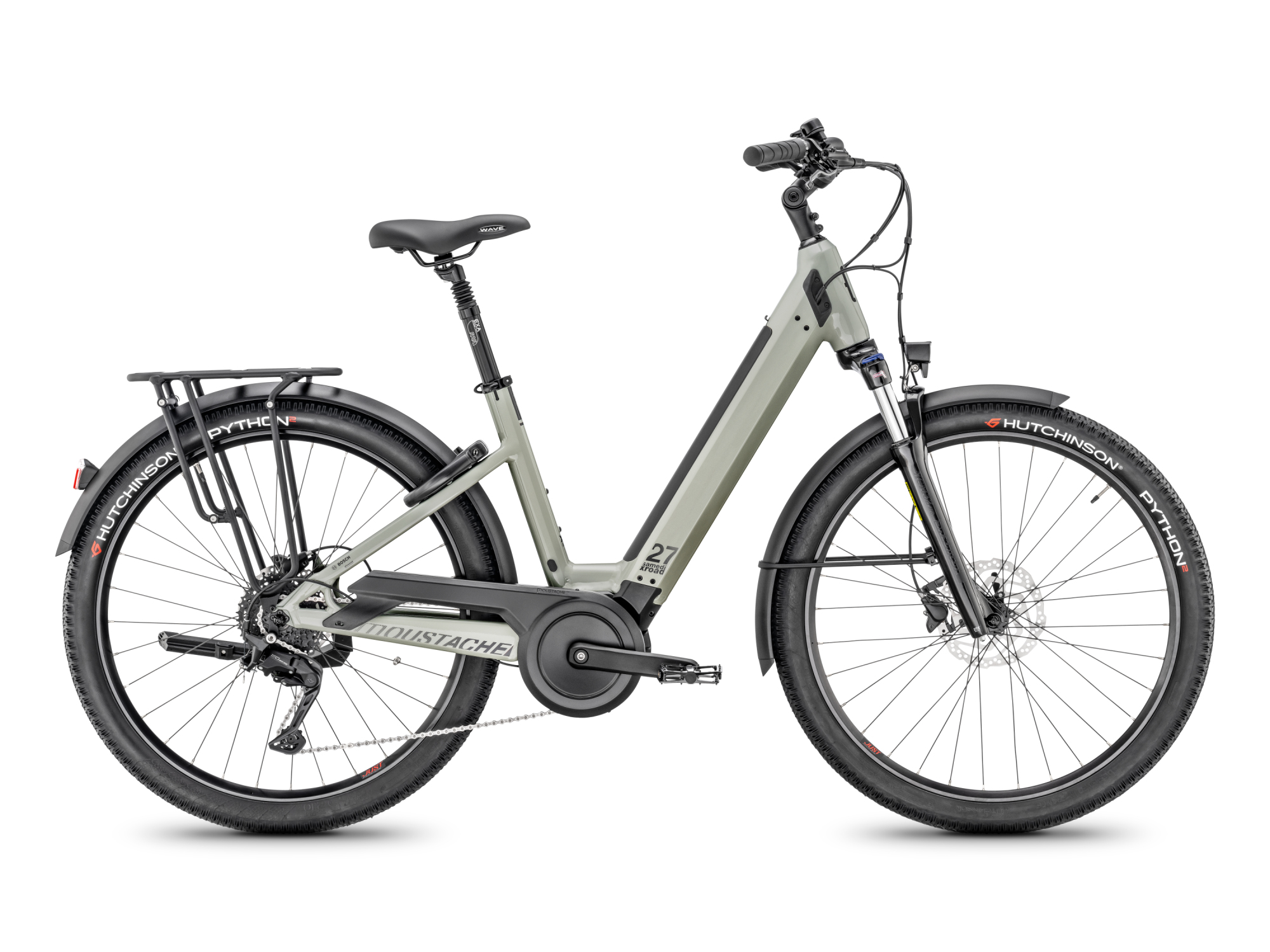 MOUSTACHE Samedi 27 Xroad 2 je všestranné elektrokolo navržené pro pohodlnou jízdu ve městě i v terénu. Je vybaveno pevným rámem s integrovanou baterií Bosch PowerTube a motorem Bosch Performance Line, který poskytuje výkon 250 W a točivý moment 75 Nm. Přední odpružená vidlice SR Suntour XCM ATB s 80mm zdvihem zajišťuje komfortní jízdu na různých površích. Model je osazen 9rychlostní přehazovačkou Shimano CUES a hydraulickými kotoučovými brzdami Shimano MT200. Ráfky Moustache o průměru 27,5″ jsou obuty do plášťů Hutchinson Python 2 o rozměru 27,5×2,10, které poskytují dobrou trakci a nízký valivý odpor.