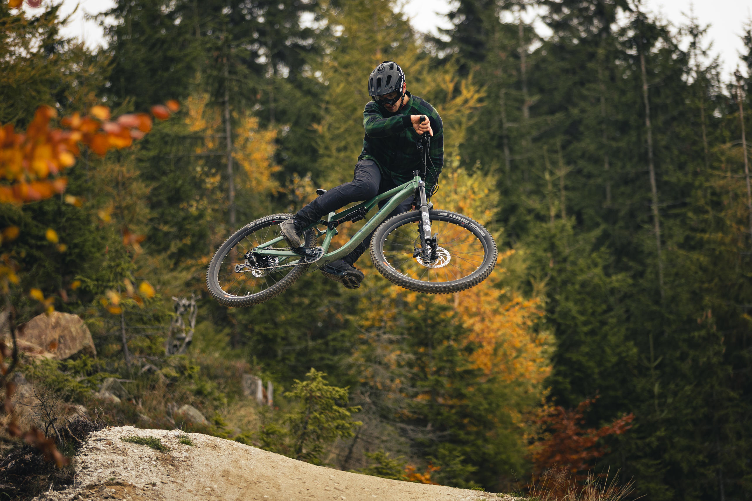 Ne každý polet je vždycky s čistým dopadem. Odolné enduro ráfky Rodi Tryp 30 ale zvládnou hrubší zacházení a sem tam nějakou hranu na doskoku odpustí. Pro ještě větší zábavu na trailech jsou obuté do kvalitních plášťů Schwalbe Tough Tom.