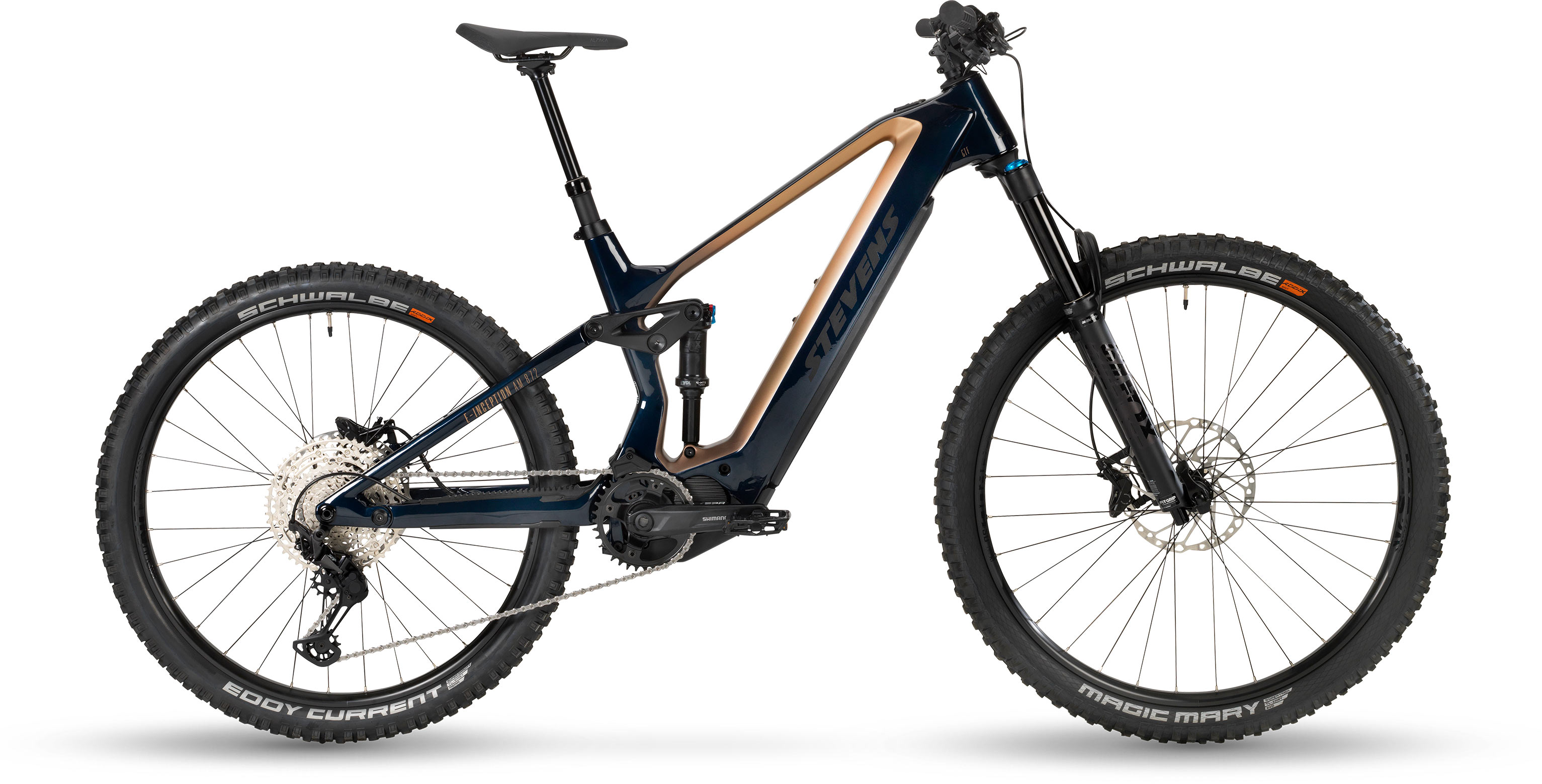 - Pláště: Robustní pláště Schwalbe Magic Mary Evolution (přední) a Schwalbe Eddy Current Evolution (zadní) 2.6″.